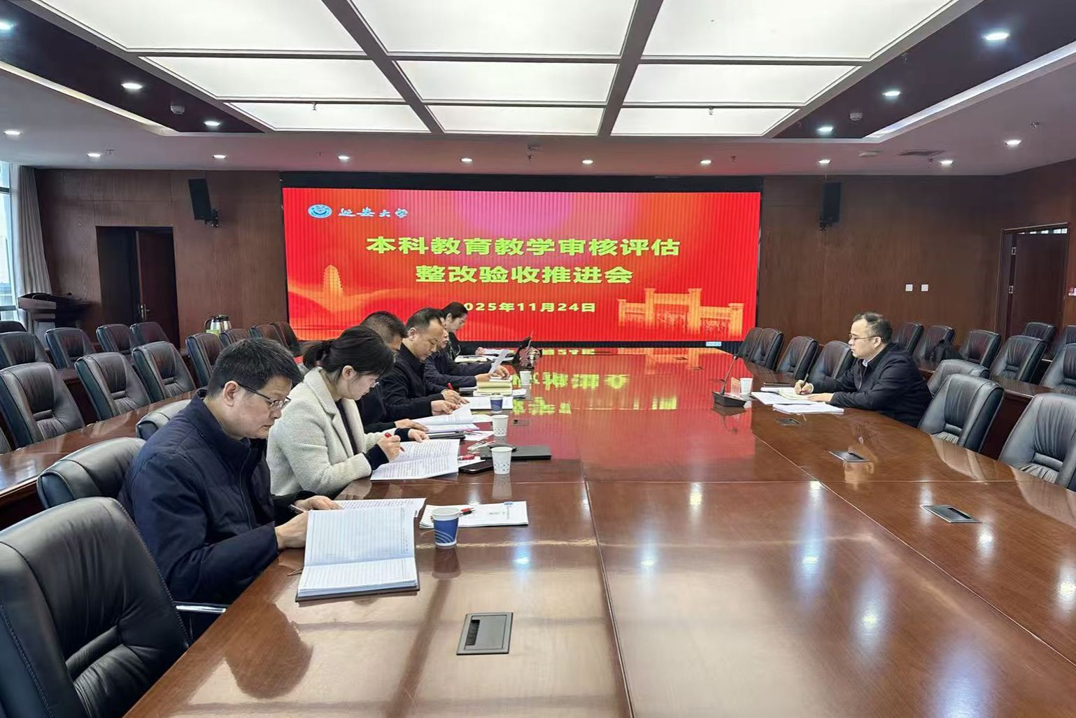 王文东对本科教育教学审核评估整改工作进展情况、整改数据核查情况和专家组进校准备工作作了详细汇报。教务处处长王进就整改任务落实和整改支撑材料准备情况进行了汇报说明。