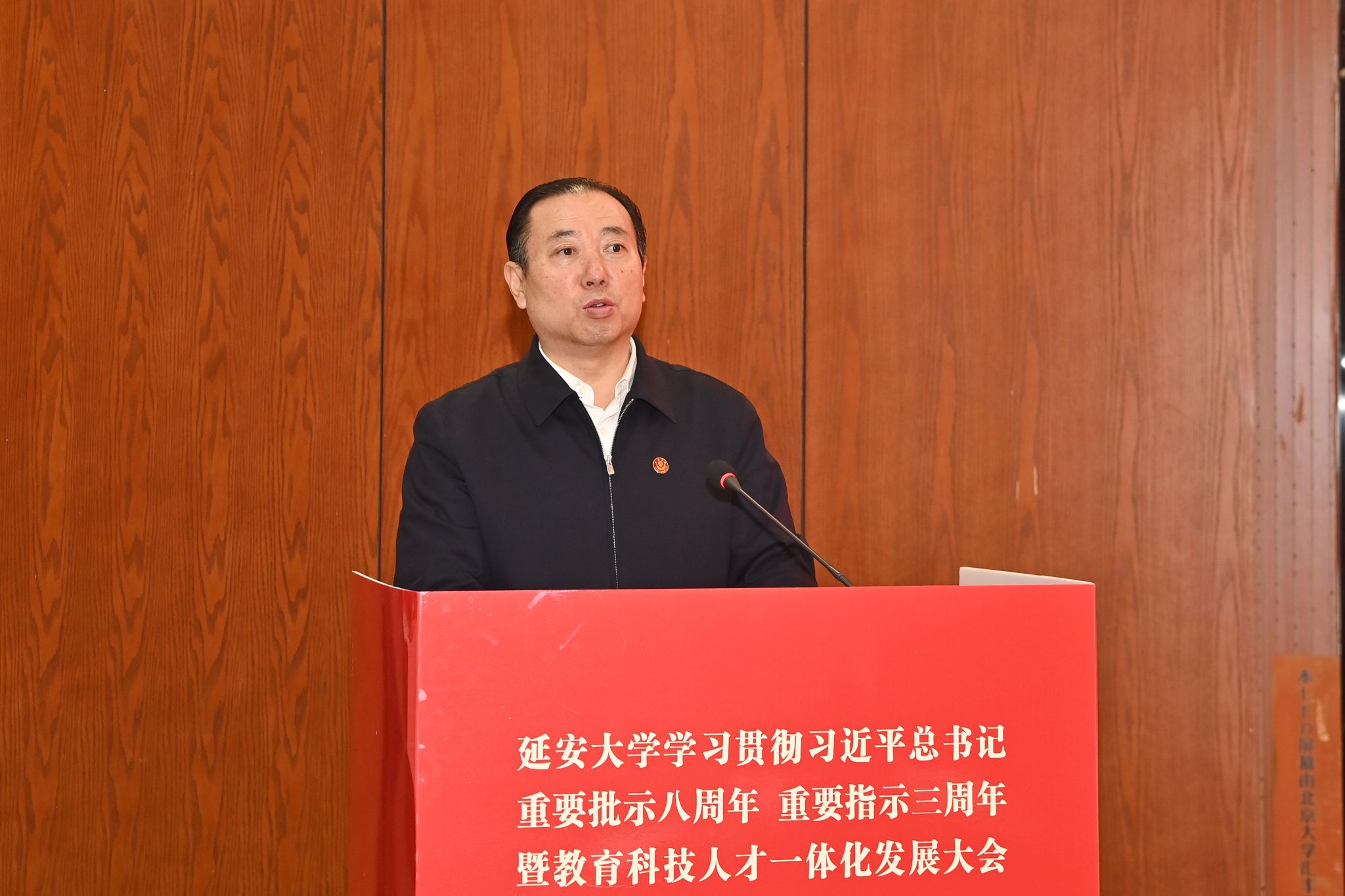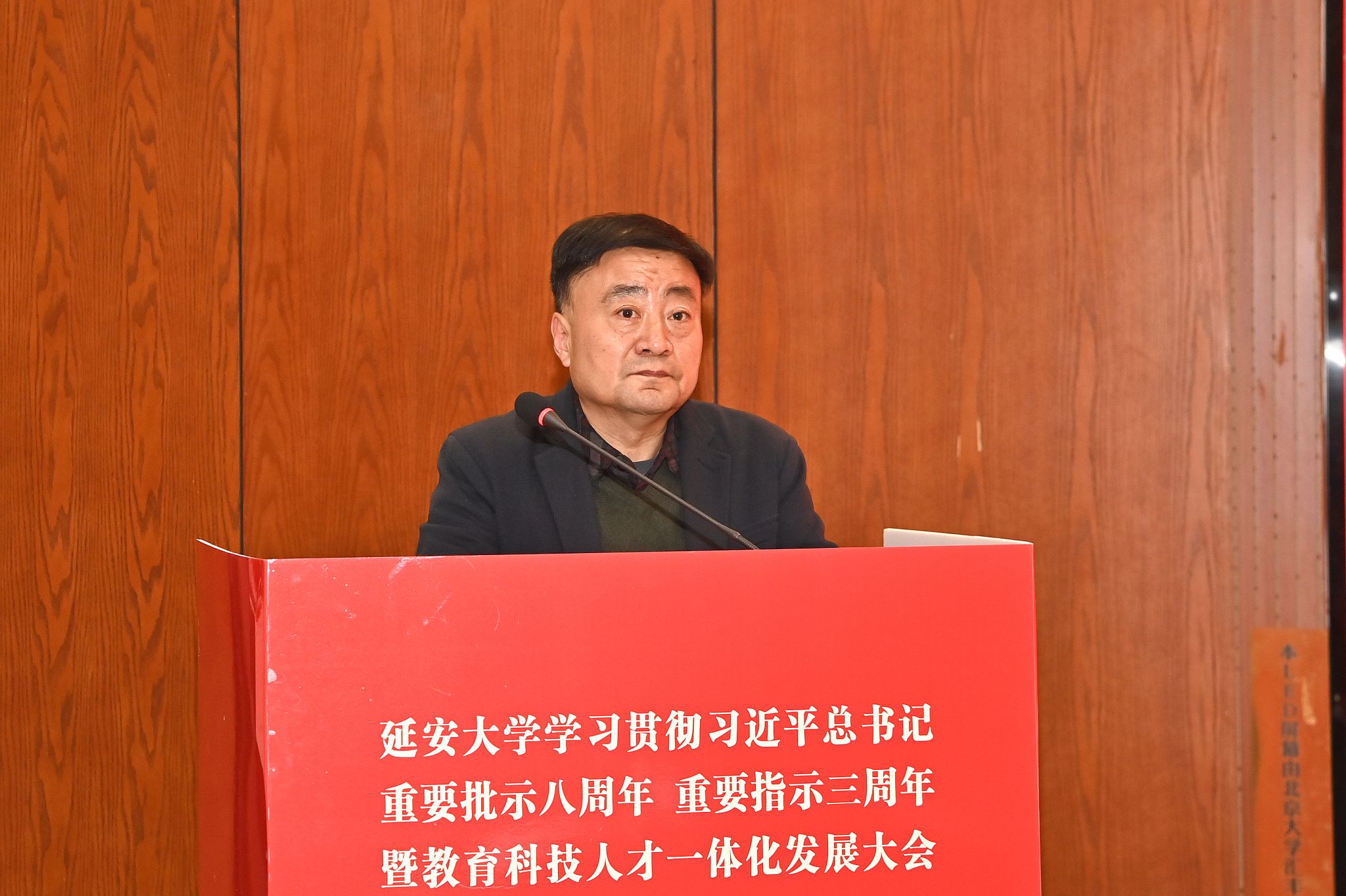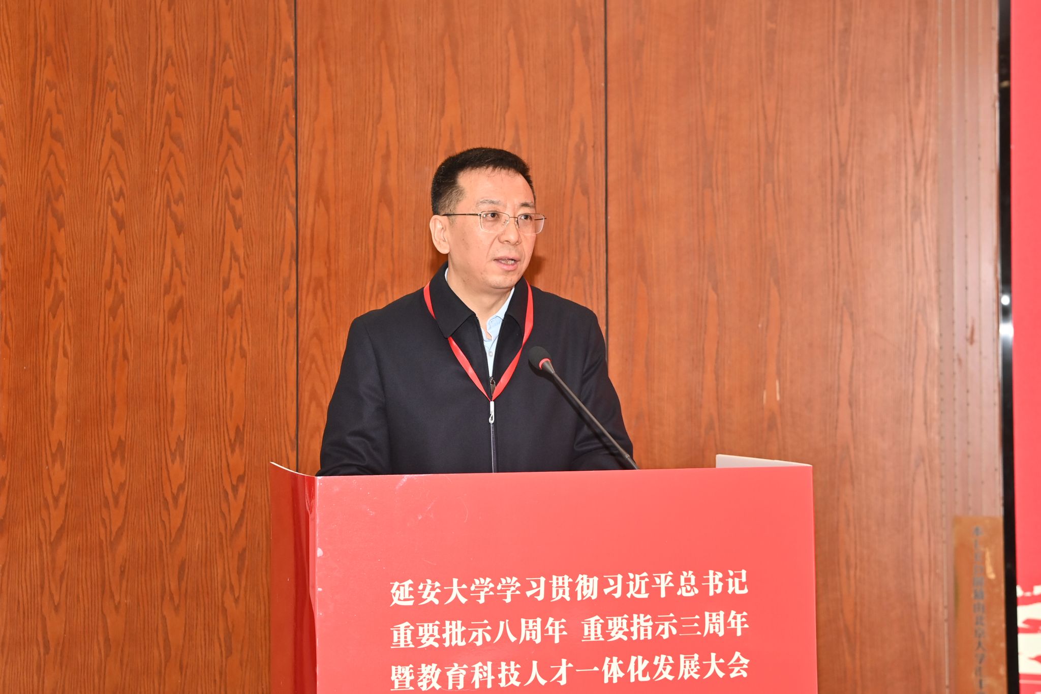 高子伟在总结讲话中回顾了学校近年来的发展成就,并就深入贯彻落实习近平总书记重要批示指示精神、推进教育科技人才一体化发展提出四点要求:一要牢记嘱托、锚定航向。坚定不移推进更有特色、更有水平大学建设,把学习贯彻总书记批示指示精神的成效转化为谋划“十五五”发展规划、推动“1195”工作布局落地的实际行动。二要深化认识、把握机遇。深刻领会教育、科技、人才一体发展的重大战略意义,切实增强推进一体化发展的行动自觉,在服务中国式现代化建设中彰显延大担当。三要聚焦重点、精准发力。扎实推动校地融合发展示范校建设突破起势;强化有组织科研,聚力打造服务区域发展的科技创新高地;持续激发人才活力,营造人尽其才的良好生态。四要加强领导、强化保障。推动党建与业务深度融合、建立健全高效运行机制、持之以恒加强作风建设,为改革发展提供坚强政治保证。他强调,要大力弘扬延安精神,勇于改革创新,将大会凝聚的共识转化为推动学校高质量发展的强大动力,不断把更有特色、更有水平大学建设推向前进,为教育强国、教育强省建设作出新的更大贡献。