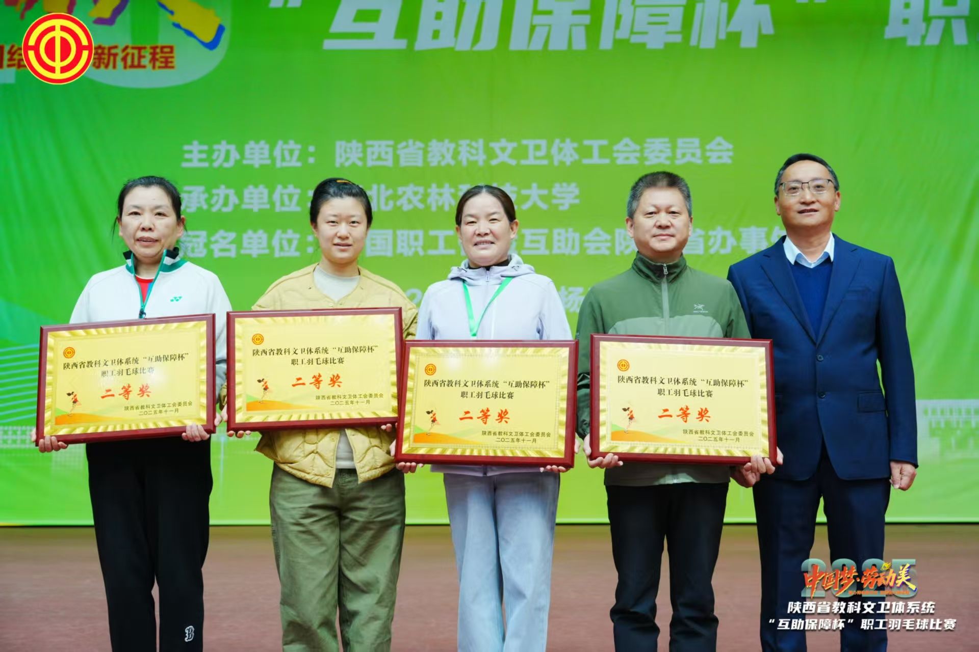 本网讯 10月31日至11月2日,“中国梦·劳动美——凝心铸魂跟党走 团结奋斗新征程”2025年陕西省教科文卫体系统“互助保障杯”职工羽毛球比赛在西北农林科技大学体育馆举办。来自全省57个单位的领队、教练员、运动员及裁判员共计800余人参赛。由万象城工会组织、教职工羽毛球协会选派组成的教职工羽毛球代表队,经过激烈角逐,最终跻身八强,荣获二等奖。