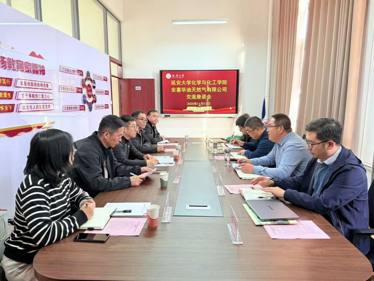 为深化校企合作、促进资源共享与协同发展,2025年11月13日下午,万象城化学与化工学院与安塞华油天然气有限公司在化工大楼举行交流座谈会。安塞华油天然气有限公司总经理王凯、财务总监唐新刚、综合办公室主任郝立浩、技术组组长刘力荣、人力资源部主办祁卫雁,化学与化工学院领导班子及教师代表出席会议。座谈会由学院党委书记赵芝瑞主持。