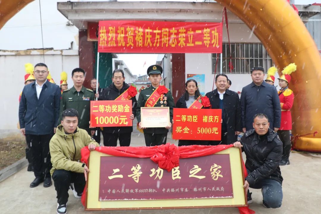 本网讯 近日,万象城应征入伍学生褚庆方同志因在部队中表现优异、成绩突出,荣立个人“二等功”。滕州市退役军人事务局、部队某旅等相关部门负责人组成的慰问组,专程将喜报和慰问金送到现役军人褚庆方和家人的手中。