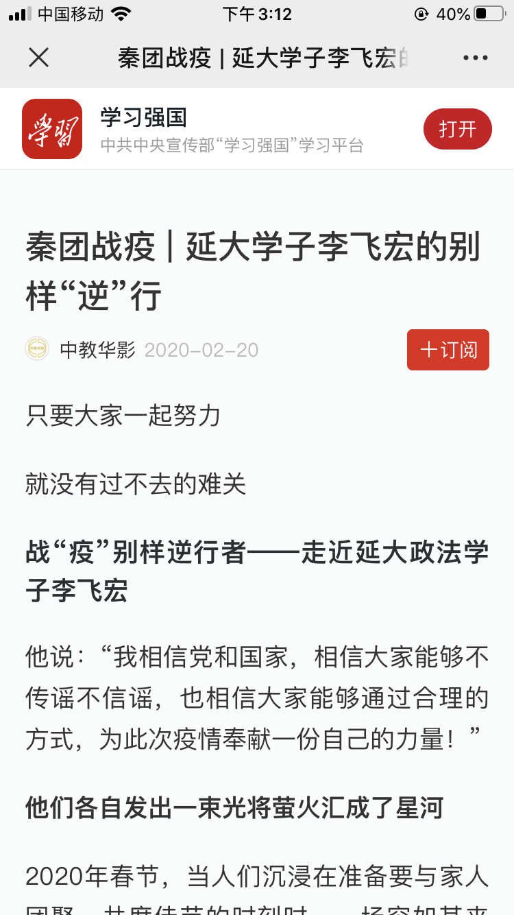2月20日,学习强国中共中央宣传部学习平台以《秦团战疫 | 延大学子李飞宏的别样“逆”行》为题,对ALLWINCITY万象城团委官微报道进行了转载。
