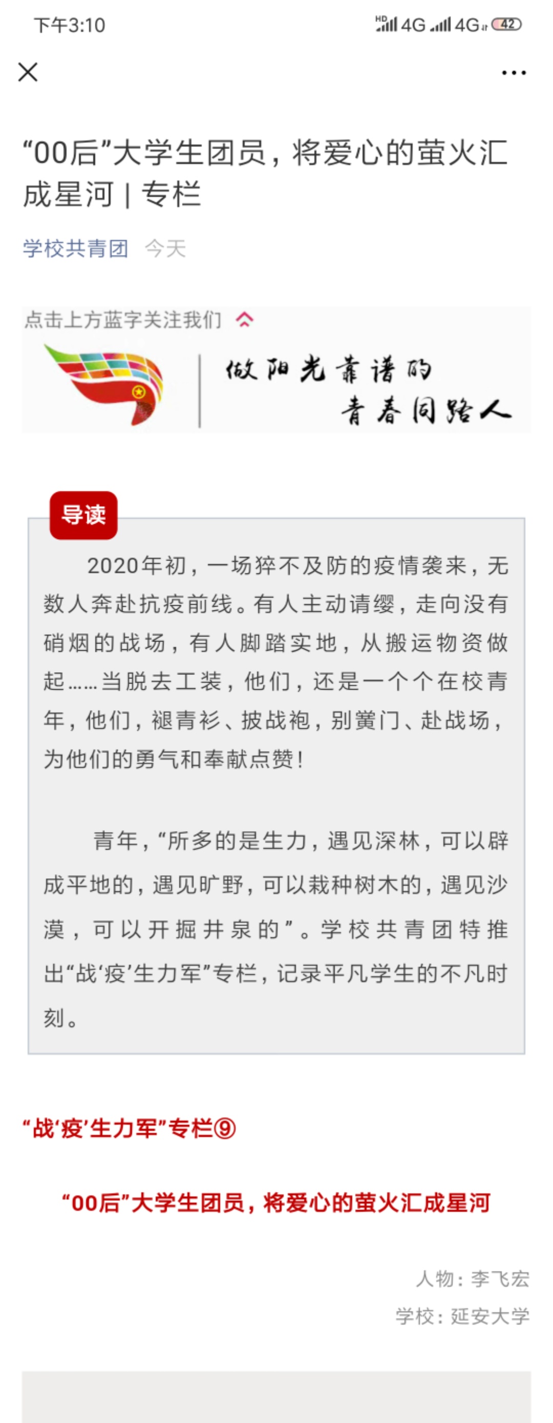 2月25日,团中央学校共青团官微专栏,发布了《“00后”大学生团员,将爱心的萤火汇成星河》的稿件,详细报道了李飞宏的抗“疫”事迹。