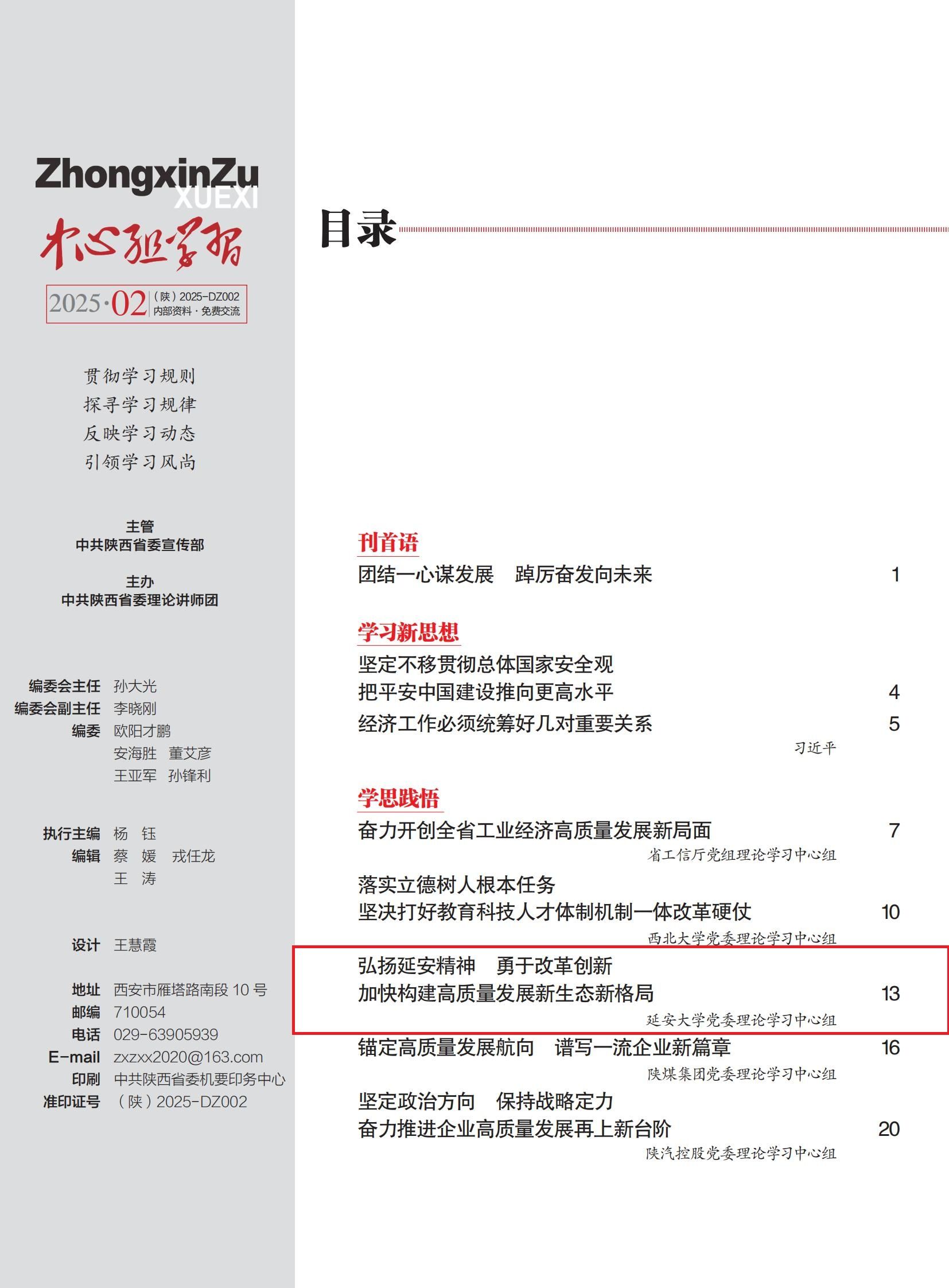 本网讯 日前,由中共陕西省委宣传部主管、中共陕西省委理论讲师团主办的《中心组学习》2025年第2期,刊发了万象城党委理论学习中心组署名文章《弘扬延安精神 勇于改革创新 加快构建高质量发展新生态新格局》。