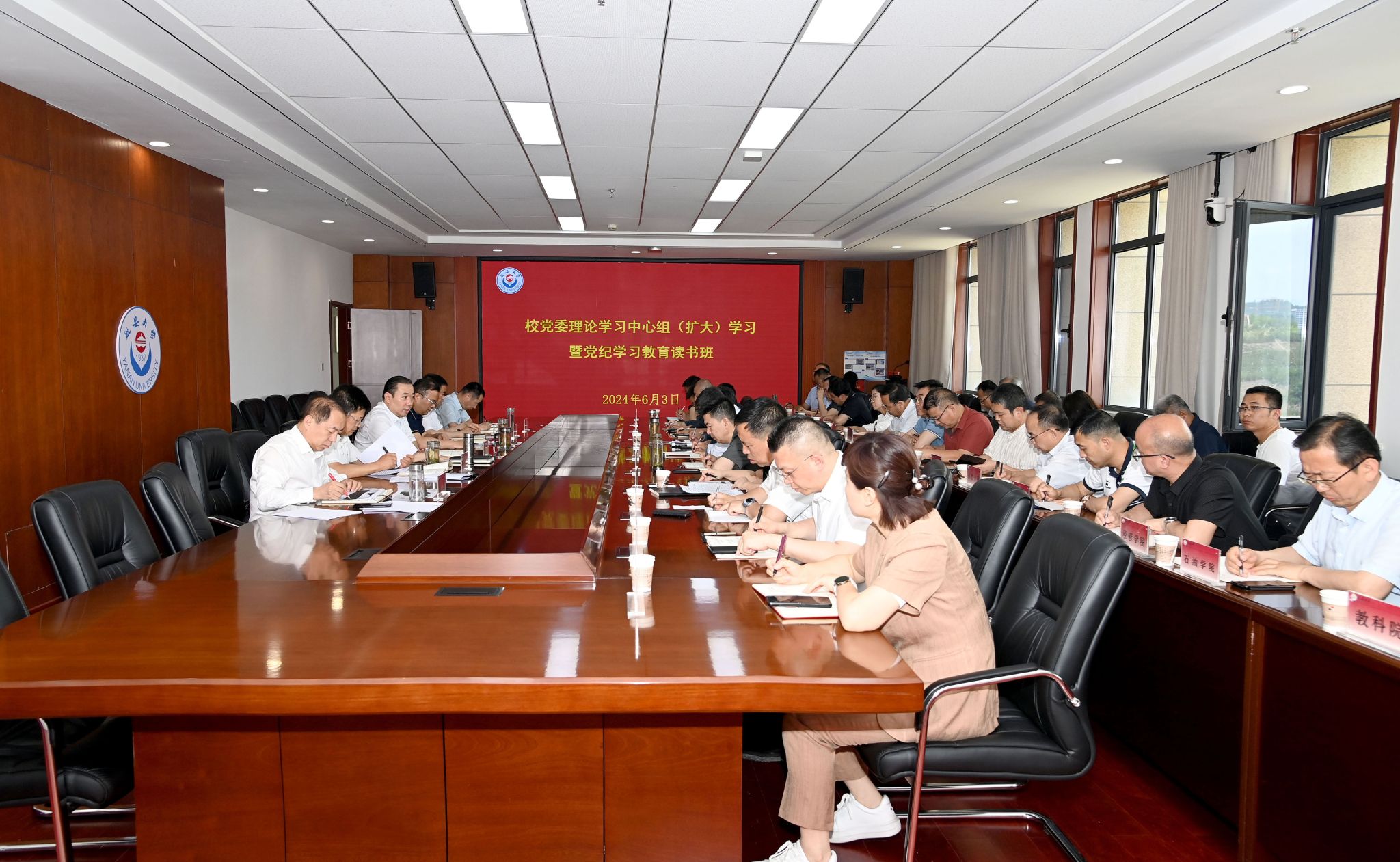 本网讯 6月3日下午,万象城党委理论学习中心组(扩大)学习暨党纪学习教育读书班在新城校区行政楼七楼会议室举行。校党委书记高子伟主持并讲话,全体在校校领导,各二级党委书记,党(校)办、组织部、宣传部、统战部、纪委、教师工作部、学工部、团委、稳定办、教务处、人事处、发展规划处、保卫处等部门主要负责同志参加会议。