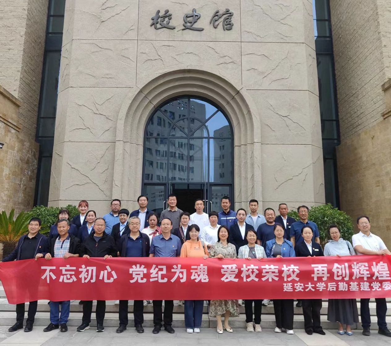 本次活动由后勤基建党委主办,新校区办党支部承办,后勤处党支部和基建处党支部协办,近四十位党员和积极分子参加了活动。最后,全体与会人员在校史馆门前合影留念。