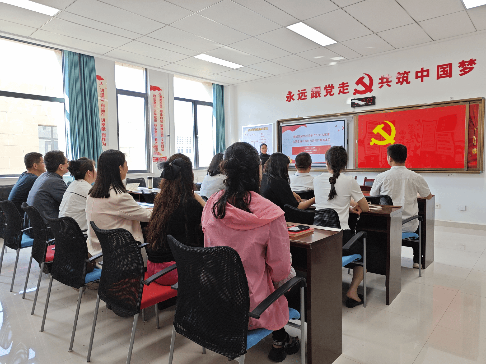 王丽影从党的纪律处分工作原则讲起,明确了纪律处分原则、适用范围、处分种类及违纪种类。并结合中国共产党纪律处分条例历次修订情况,明确了违反党纪的种类。最后,详细讲述了违反“政治纪律”“组织纪律”“廉洁纪律”“群众纪律”“工作纪律”“生活纪律”六大纪律的负面清单。她指出,所有纪律中,最基本的还是生活纪律,所有党员都应该从“修身齐家”开始,谨言慎行,廉洁自律,锤炼自身道德品行,带头实践社会主义核心价值观和社会主义荣辱观,提倡共产主义道德,弘扬中华民族传统美德,努力在生产、工作、学习、社会生活和家庭生活方面起到先锋模范作用,这样才能永葆忠诚干净担当的共产党员本色。