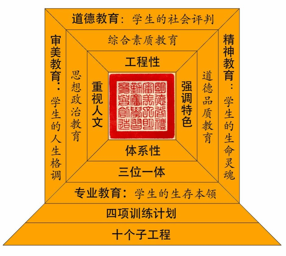 2、专业能力教育、道德品质教育、审美教育、精神教育——四个突出的教育要求,倡导五育并举,强调融合建设与相互承载,指引学生成长方向。