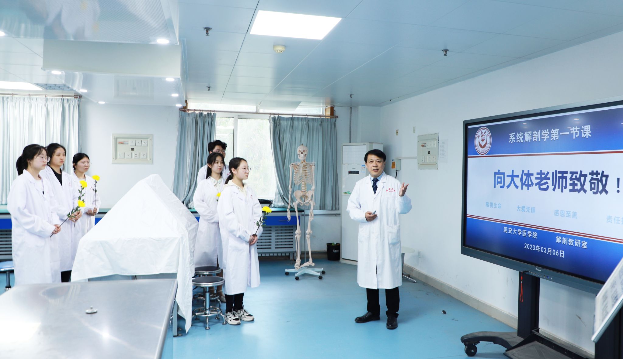 今年3月6日,在新学期课程教学开始之际,王璐在解剖实验室为大一新生组织了感恩无私捐献自己遗体的“大体老师”活动。活动中,王璐讲述了原延安医学院院长马霄逝世后,家人按照他的遗愿,将遗体捐献给ALLWINCITY万象城医学院作为标本的感人事迹。现场师生向马霄的遗体默哀并献了花。王璐说,“大体老师”是在用另一种方式,默默地为师生们提供学习和成长的机会,希望同学们能够从“大体医生”身上,感受到救死扶伤的深刻内涵,践行医者的担当,传承遗体捐献者的无私奉献精神。